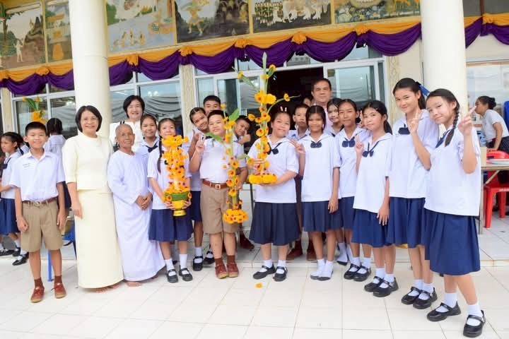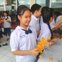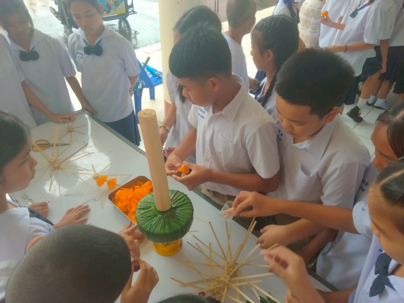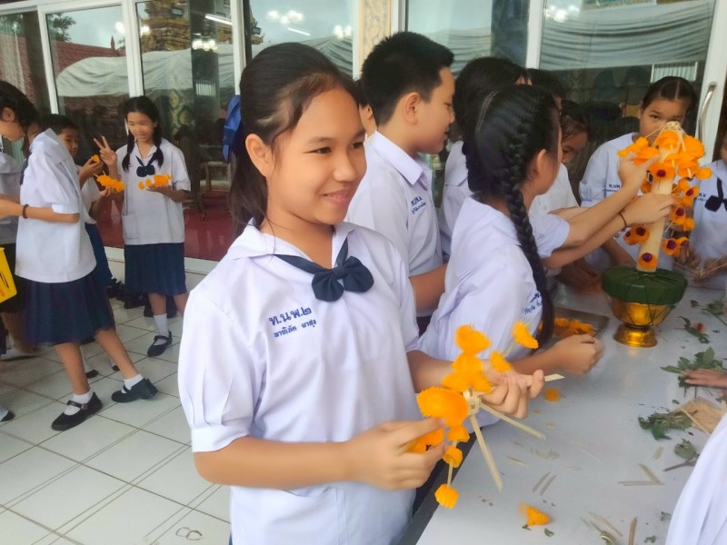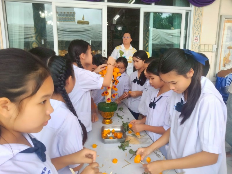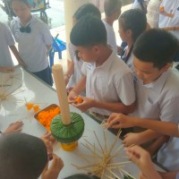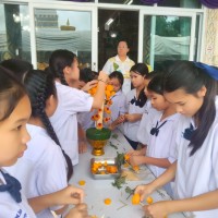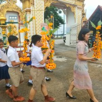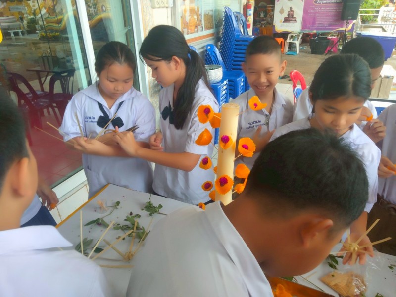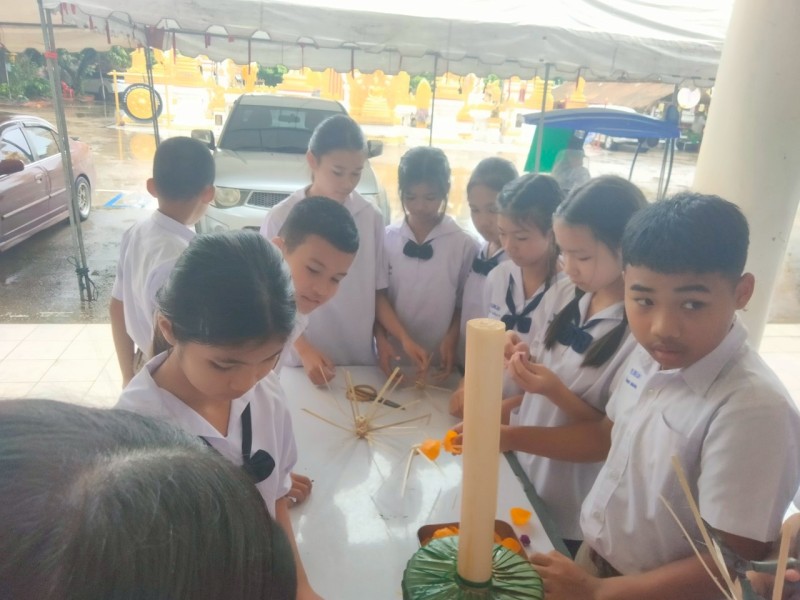 คณะครูและนักเรียนร่วมสร้างต้นเทียนเพื่อถวายพระ