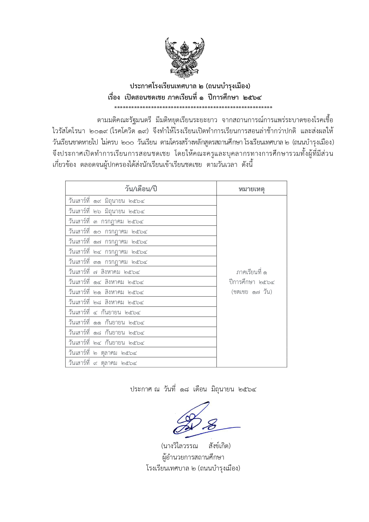 ประกาศเรียนชดเชยวันเสาร์ เทอม 1 ปีการศึกษา 2564